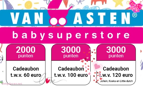 Babystore Van Asten heeft ook nog een gratis baby spaarprogramma. Win je bijvoorbeeld niet. Dan kan je altijd nog sparen voor gratis babyspulletjes. Zo krijg je dus toch gratis producten voor je kindje. Je hebt bijvoorbeeld voor 200 punten als een gratis cadeaubon van €4,- tot 3000 punten waar je beloond wordt met een gratis cadeaubon van €120,-. Er zijn dus ook andere manieren om aan gratis shoptegoed te komen.